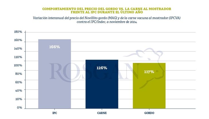 Los precios del novillito gordo aumentaron en el último año a razón del 117% a noviembre. Si bien durante el último mes las valores tendieron a reacomodarse ligeramente, registrando aumentos nominales en torno al 9% respecto de octubre y en lo que lo que va del mes suman otro 10% de suba adicional, medidos contra IPC siguen estando retrasados, por el simple efecto de la inflación que venimos arrestando de meses pasados. Recodemos que, en diciembre 2023, el IPC llegó a marcar una variación mensual del 25,5%, acumulando hasta marzo de este año más de 70 puntos de inflación.