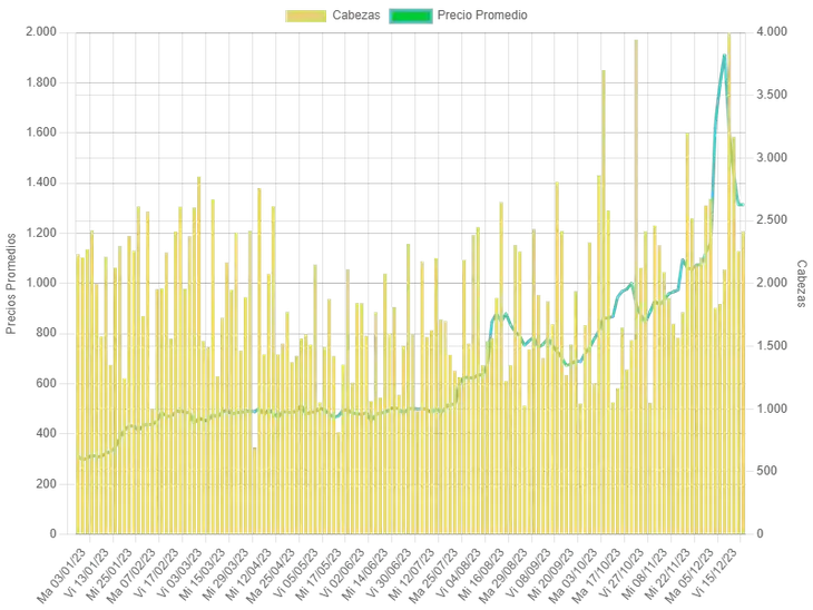 En el caso de las vaquillonas, la evolución fue similar. Comenzaron el año en 300 pesos, llegaron a un techo de 1.824 pesos (una diferencia de 1.524 pesos con respecto al piso) y finalizaron 2023 con un promedio de 1.245 pesos, una brecha de 945 pesos en relación al primer mes del año.