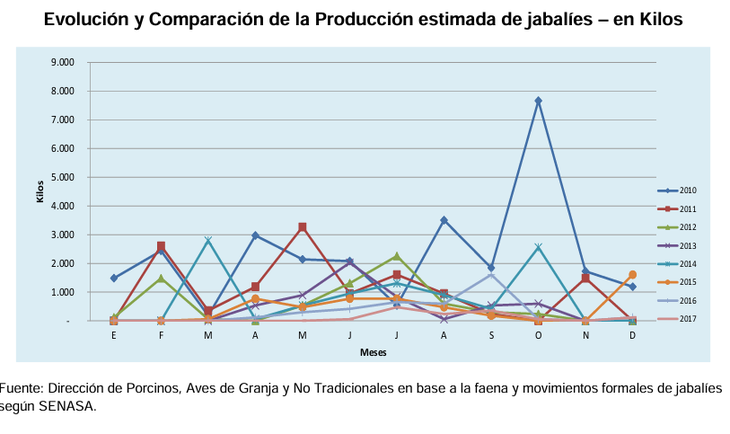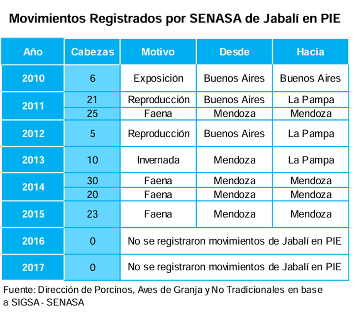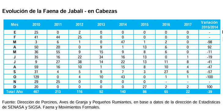 "De los 11 establecimientos de faena habilitados por SENASA, 4 estuvieron activos en 2017, de los cuales solo uno trabajó jabalí. La razón fue una modificación de los requisitos SENASA para los establecimientos faenadores/despostadores", afirma un informe sobre jabalíes de la Dirección Nacional de Producción Ganadera, dependiente del ministerio de Agroindustria de Nación .