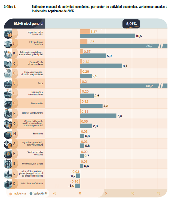 Trece de los quince sectores que integran el EMAE mostraron subas interanuales. Los mayores aportes positivos vinieron de Intermediación financiera (+39,7% ia) y Actividades inmobiliarias, empresariales y de alquiler (+5% ia). Sin embargo, el dato que más sorprendió al mercado fue el desempeño del sector Pesca, que se disparó 58,2% interanual y aportó +1,36 puntos porcentuales al crecimiento total del EMAE, convirtiéndose en el segundo rubro de mayor incidencia positiva del mes.