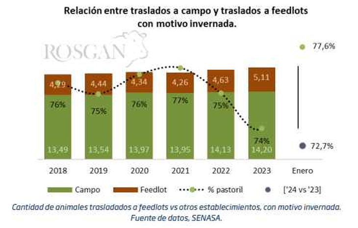 Sin embargo, al comparar los datos de enero las cifras ya comienzan a mostrar una importante recomposición de los sistemas pastoriles en relación al corral, al pasar de una relación que en enero del año pasado representaba menos el 73% al 77,6% este año, unos 5 puntos de incremento en la proporción de animales trasladados a campos de invernada contra los trasladados a corrales.