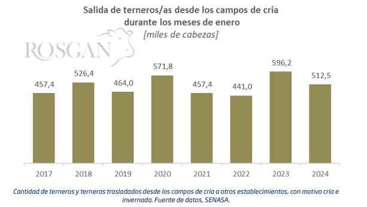 De acuerdo a los datos de traslado de hacienda publicados por SENASA, durante el primer mes del año salieron de los campos de cría un total de 512.538 terneros y terneras, lo que representa un 14% inferior al registrado en enero pasado cuando, producto de la seca, un total de 596.000 terneros debieron salir de los campos, el mayor movimiento registrado para ese mes desde 2017, año desde el que dispone este tipo de registros.