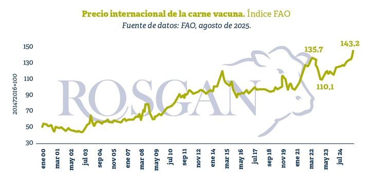 A la luz de lo observado en los últimos meses, podríamos decir que los precios de la carne vacuna en el mundo muestran un recorrido alcista sin precedentes. En agosto, el índice de precios de la carne elaborado por la FAO registró una suba del 2% respecto a julio y consolidó un nuevo récord nominal con 143,2 puntos básicos.