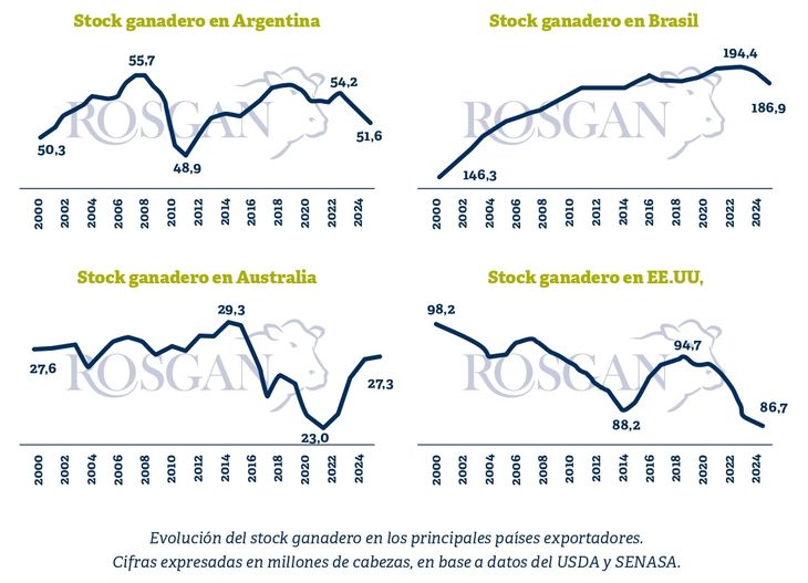 A diferencia de ello, Estados Unidos está empezando lentamente a avanzar hacia una fase de reconstrucción que posiblemente se vea plasmada reciente a partir de 2026 y 2027. En tanto que Brasil aún se encuentra en plena retracción de su rodeo, ya sin restricciones desde el punto de vista climático, pero con fuertes incentivos de precios que continúan impulsando una elevada faena.
