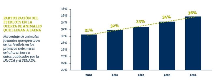 Sobre estos números y en un escenario climáticamente mucho más benévolo que el registrado el año pasado, resulta sorprendente la creciente participación del feedlot dentro de los procesos de engorde y terminación. De acuerdo a las estadísticas publicadas por el SENASA en base a los DTe, se conoce que, en los primeros siete meses de este año, pasaron por los feedlots 2.800.665 animales que, medidos sobre los animales faenados en igual período, representan un 36% del total, marcando una tendencia linealmente creciente en los últimos cinco años. A su vez, este porcentaje supera en 2 puntos el registro del año pasado, dado en un contexto de fuerte seca donde el feedlot fue el refugio casi obligado para gran parte de la hacienda que debía salir de los campos.
