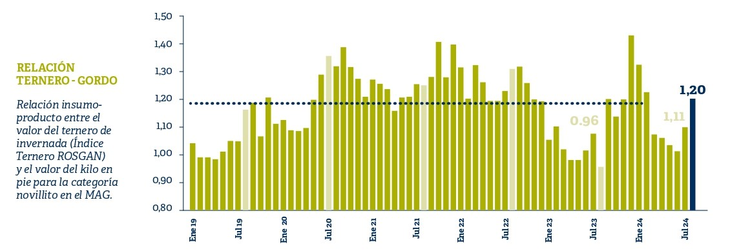 Mientras que en julio se precisaron 1,11 kilos de novillito para la reposición de 1 kilo de ternero, en lo que va de agosto esta relación ya se ubica en 1,20 kilos, un 25% más caro de lo que costaba esa misma reposición, un año atrás.