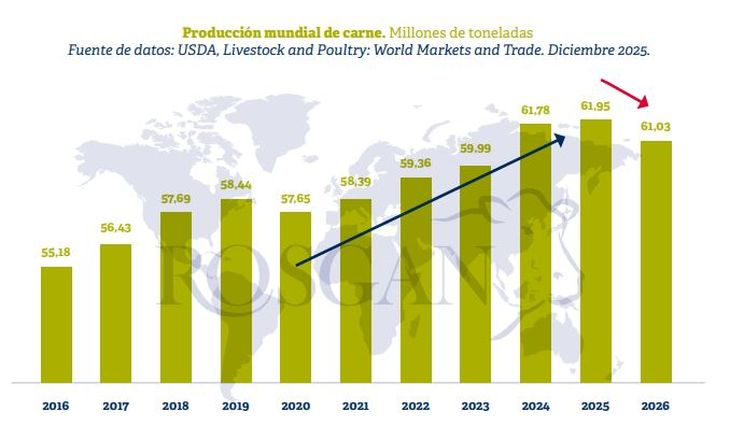 Sin embargo, de manera sorpresiva, al momento de publicarse este informe —y tras varias semanas de retraso en su difusión debido al cierre temporal de los servicios oficiales— el USDA finalmente dio a conocer sus proyecciones sobre producción y comercio mundial de carnes para el próximo ciclo, confirmando la caída anticipada. Este ajuste resulta particularmente relevante, ya que marca el fin de un prolongado período de crecimiento de la producción global registrado durante los últimos cinco años.