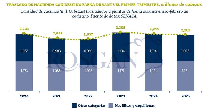 Por lo pronto, la hacienda gorda que llega al mercado aún es ajustada; estacionalmente es un período en el que la oferta de novillitos y vaquillonas livianas que llegan a faena tiende a ser acotada, a diferencia de los meses de agosto en adelante donde el nivel de oferta comienza a crecer. No obstante, los datos que se desprenden de la estadística de traslados de hacienda con destino faena muestran para este primer bimestre del año una oferta total de animales ligeramente menor al año pasado (-1%) pero con mayor cantidad de animales jóvenes, precisamente un 2% más de novillitos y 8% más de vaquillonas que, en suma, hacen un total de 1,18 millones de cabezas, es decir el 54% de la faena total contra el 50% aportado en igual período del año pasado.