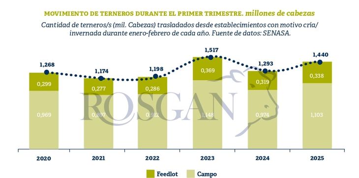 No obstante, en números absolutos, la cantidad de traslados no muestra un dato menor. Por el contrario, en los dos primeros meses de este año el registro de movimientos asciende a 1,44 millones de terneros/as, el segundo registro más alto de los últimos años.