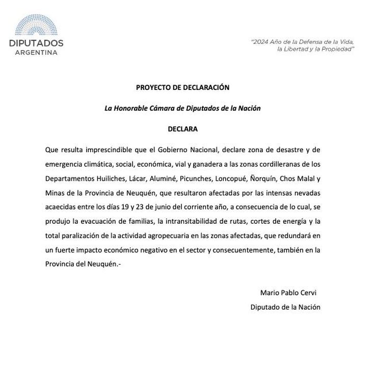El diputado radical criticó al gobierno provincial y pidió declarar zona de desastre y emergencia climática, social, económica, vial y ganadera a las zonas cordilleranas de los Departamentos Huiliches, Lácar, Aluminé, Picunches, Loncopué, Ñorquín, Chos Malal y Minas de la Provincia del Neuquén.