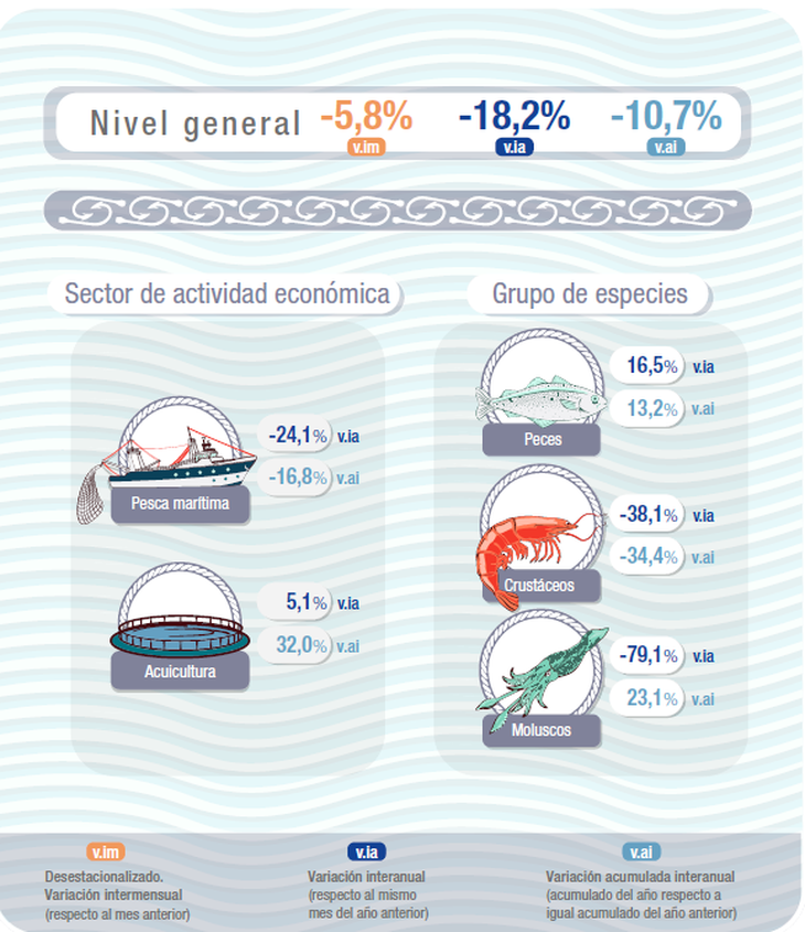 En el extremo opuesto, los crustáceos y los moluscos mostraron cifras alarmantes para la industria. Los crustáceos, vitales para la rentabilidad de muchas empresas pesqueras, cayeron un 38,1% en noviembre. El acumulado anual para este grupo de especies se situó en un 34,4% negativo.