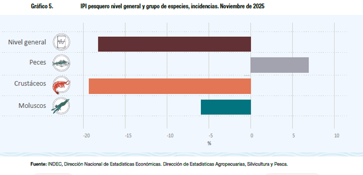 La evolución de la producción varió drásticamente según el recurso biológico capturado. El grupo de los peces se destacó como el único segmento extractivo con signo positivo durante noviembre, con un alza del 16,5% interanual y un acumulado del 13,2% en el año. Este crecimiento generó una incidencia positiva de 6,9% en el nivel general del IPI pesquero.