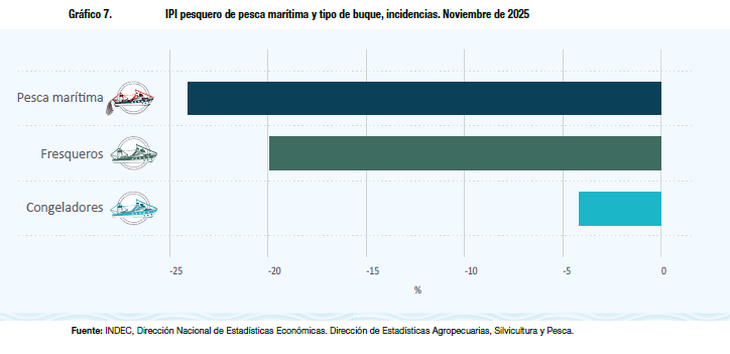 Esta actividad acumula un saldo negativo del 16,8% en los primeros once meses del año. Los desembarques de las flotas comerciales reflejaron esta merma, con una incidencia negativa de 19,3 puntos porcentuales sobre el nivel general del índice.