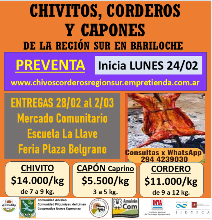 La Red de Organizaciones de la Región Sur ofrece chivitos, corderos y capones frescos provenientes de familias campesinas y productoras de la Línea Sur, y cuenta con el apoyo del Mercado Comunitario Municipal de Bariloche, el INTA EEA Bariloche y el CEPAF-IIDYPCA/CONICET-Universidad Nacional de Río Negro.