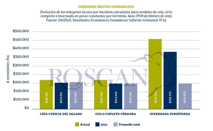 Asimismo, si vamos a un modelo de ciclo completo planteado para el área subhúmeda pampeana -Córdoba, San Luis, y oeste de Buenos Aires- también presenta buenos valores. Sobre una superficie de 2.100 hectáreas y 600 vacas, con unos 149 novillos gordos por año, el MB resultante es de 182.638 $/ha., esto es un 10% mayor que el promedio de la serie y un 11% superior al margen de febrero de 2024.