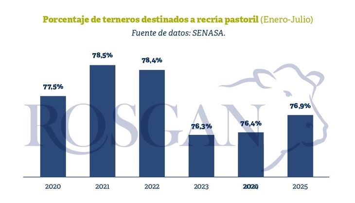 En efecto, de los 7,2 millones de terneros que salieron de los campos de cría en estos primeros siete meses del año, el 23% fue destinado directamente a feedlot, mientras que el 77% restante ingresó a sistemas de recría a campo, una proporción que en los últimos dos años había caído significativamente producto de la sequía y que a partir de este año lentamente comienza a recuperar terreno.
