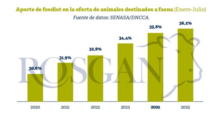 Sin embargo, el aporte del feedlot en la etapa final de esos animales recriados también es un factor clave en la producción de carne. Esto se refleja en la creciente participación del feedlot dentro de la oferta de animales que llegan a faena, lo que redunda en un mayor control y una mejor calidad de terminación.