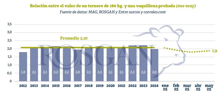 Lo interesante para el criador es focalizarse en otra relación de reposición que actualmente favorece la compra de vientres debido a la revalorización de su producto estrella, el ternero. Bajo el mismo cálculo, si analizamos la relación entre el valor de un ternero macho de 180 kg y una vaquillona preñada, vemos que aun siendo mucho mas estable que la anterior, este año se ubica en uno de los niveles más bajos de la serie (1,9) producto de los muy buenos valores que ofrece la invernada (Rosgan Mayo $3.500 el kilo).