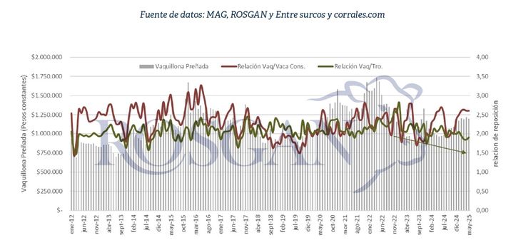 Actualmente, la relación de valores entre un vaquillona preñada ($1.200.000) y una vaca vacía de descarte ($1.100 a $1.200 el kilo) se ubica en torno a 2,6, entre un 10% y un 15% superior a lo registrado en los últimos años.