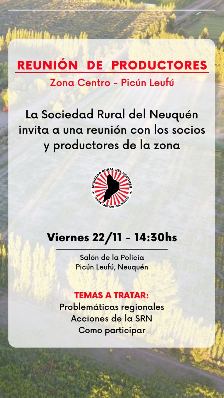 Por otro lado, hoy, viernes 22 de noviembre, a las 14.30 horas, en el Salón de la Policía, se convocó a los productores de Picún Leufú, para tratar problemáticas regionales, contar acerca de las acciones de la SRN e invitar a los interesados a participar.