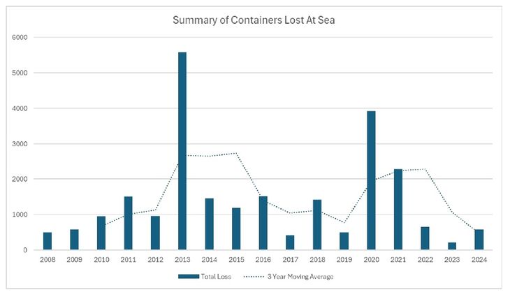 El promedio móvil de tres años, que abarca el período 2022-2024, se sitúa en 489 contenedores perdidos anualmente, lo que representa una mejora considerable frente a los 1.061 registrados en el informe previo. Esta tendencia descendente, aunque interrumpida por picos puntuales, muestra un esfuerzo sostenido de la industria por mejorar las condiciones de seguridad.