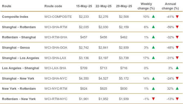 El comercio marítimo global experimenta un nuevo repunte. De acuerdo con el más reciente Índice Mundial de Contenedores (WCI, por sus siglas en inglés) publicado por Drewry el pasado 29 de mayo, las tarifas de flete para contenedores de 40 pies aumentaron un histórico 10% en una sola semana, alcanzando los 2.508 dólares. Este brusco ascenso representa el primer incremento de dos dígitos en el índice compuesto desde julio de 2024, revirtiendo una tendencia descendente que había iniciado a comienzos de año.