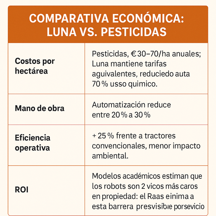 Por otro lado, cada robot Luna cubre más de 40 hectáreas por noche, y su versión ampliada, Eden, multiplica la cobertura por siete frente a sistemas tradicionales de fila simple. Esto mejora la economía de escala y reduce costos relativos por hectárea.