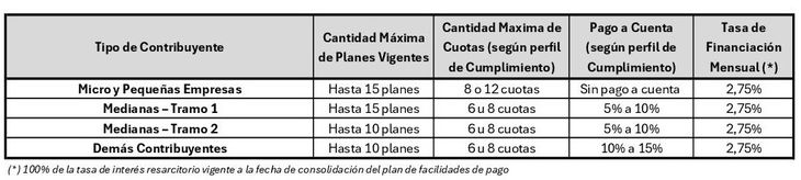-Incremento en la cantidad máxima de planes de pago: las Micro, Pequeñas y Medianas Empresas (PyME) podrán acceder hasta 15 planes de pago de manera simultánea (antes 10), y las Grandes Empresas podrán tener hasta 10 planes (antes 6).