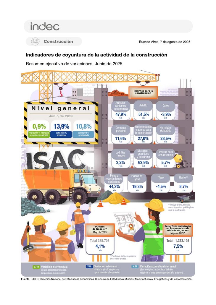 El sector de la construcción también mostró un panorama alentador. En junio, el ISAC creció un 13,9% interanual y 11 de los 13 insumos relevados por el INDEC presentaron incrementos.