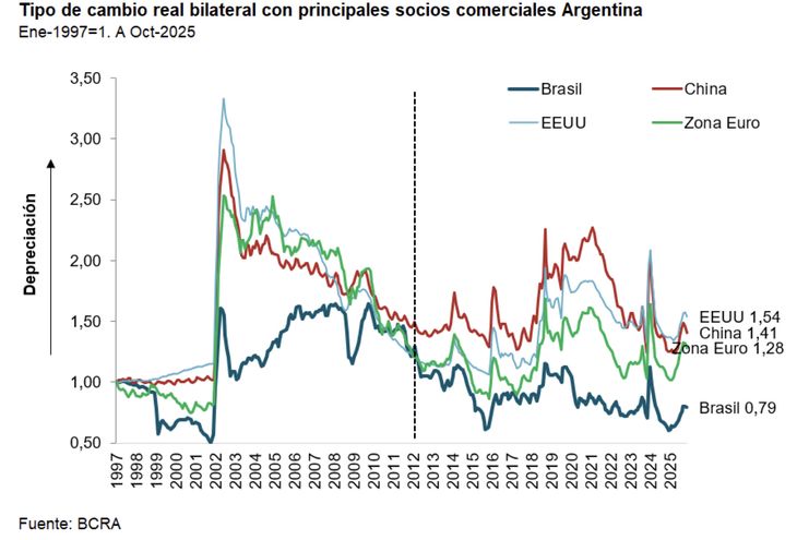 Período 2012-2025: en ese período, el tipo de cambio real bilateral del ARS con el BRL es el de los que registra mayor apreciación relativa; respecto del promedio 2012-2025 la apreciación es 11,2% y respecto de ene-2012 es 36%. Lo mismo ocurre con el CNY, que respecto al promedio está apreciado un 12,5% y sólo un 4,3% si se compara el valor actual con el de ene-2012. En cambio, comparando el ARS con el USD, la tendencia de más largo plazo es de devaluación real del Peso, una depreciación real de 9% respecto del promedio del periodo -y del 26% comparado con ene-2012. También está depreciado con el Euro; un 5,8% comparado con el promedio de 2012-2025 y de 6,1% respecto de ene-2012.