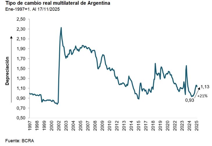 Desde una perspectiva de largo plazo, y sin tomar en cuenta otras consideraciones, niveles del índice de tipo de cambio real multilateral oficial de 1,13 (base=1, ene-1997) indicarían una apreciación real de 4,5% del Peso respecto del promedio 2012-2025 -que es 1,18.