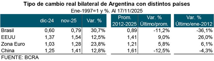 Período 2025: Comparando la situación actual (18-nov) con la de fin de 2024, el ARS se depreció en términos reales con todas las monedas de los países de la muestra: un 30,7% real respecto del BRL, 23,8% con el EUR, 12,8% con el Renmimbi (CNY) y 12,5% con el USD.