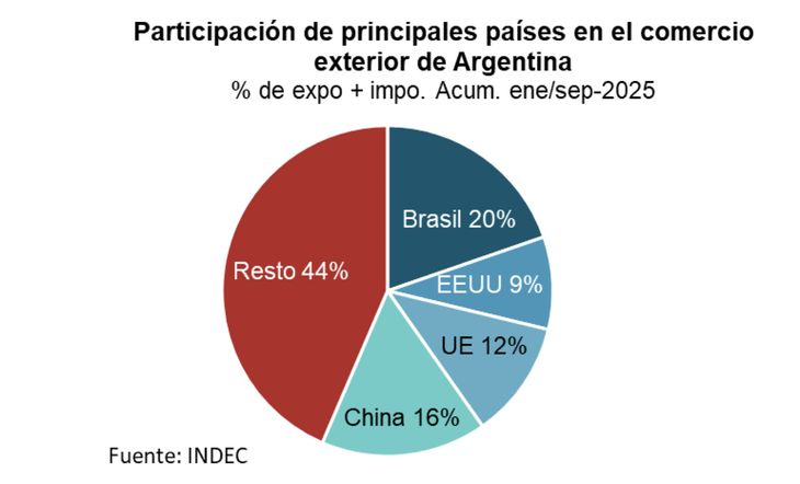 En el acumulado de enero/septiembre 2025, los principales destinos/orígenes del comercio de Argentina fueron Brasil con el 20%, China con el 16%, la Unión Europea con 12% y Estados Unidos con 9%.