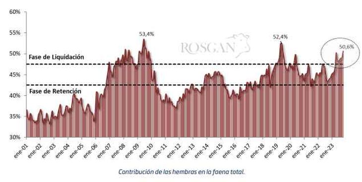 Por lo tanto, ponderando la magnitud de lo que se está faenando y la duración de este período con elevadas tasas de contribución de hembras en la faena, ya podemos estar categorizando este momento como una definida fase de liquidación, cuyo impacto se terminará de dimensionar con los números de stock que veremos publicados a finales de este ciclo.