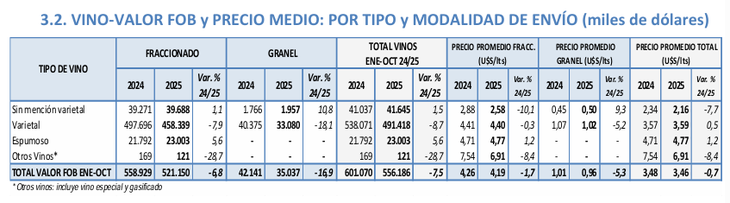 Por modalidad, los fraccionados cayeron un -5,1% a 1.244.486 hl, y los a granel un -12,2% a 365.071 hl. El valor FOB acumulado para vinos fue de 556.186 miles de dólares (-7,5%), con un precio medio total de 3,46 U$S por litro (-0,7%).