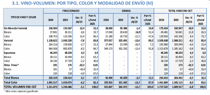 Esta disminución se distribuye de manera desigual por categorías: los vinos de color cayeron un -8,8% (de 157.786 hl a 143.975 hl), mientras que los vinos blancos registraron una baja más pronunciada del -13,3% (de 34.901 hl a 30.259 hl). Comparado con septiembre de 2025, el volumen total de vinos disminuyó un -6,5%, señalando una tendencia descendente en el cierre del año.