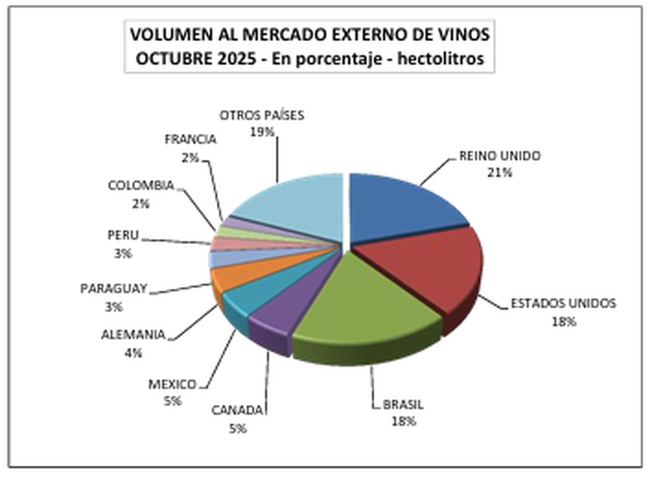 El panorama en el periodo enero-octubre de 2025 revela una contracción general en el sector. El volumen total de vinos exportados sumó 1.609.557 hl, un -6,8% menos que los 1.727.522 hl del mismo período en 2024. Los vinos de color lideraron la baja con un -8% (de 1.461.869 hl a 1.345.115 hl), mientras que los blancos se mantuvieron casi estables con un -0,5% (de 265.653 hl a 264.442 hl).