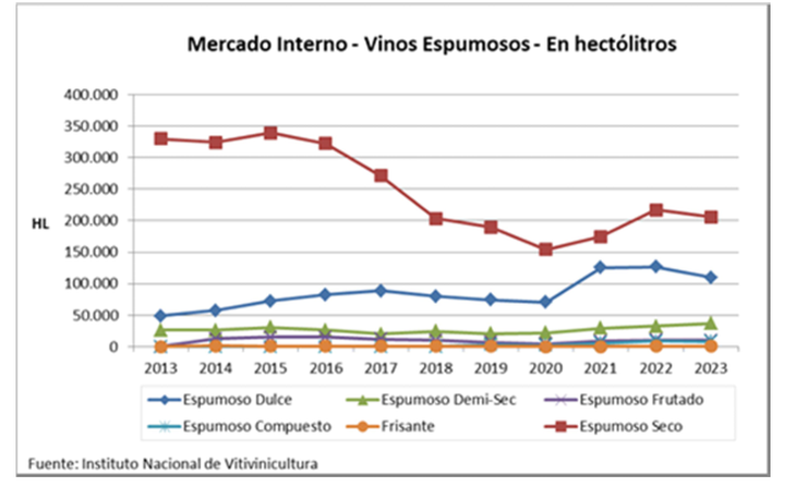 En 2023 se comercializaron 372.188 hl de vino espumoso en el mercado interno. Considerando el período 2014-2023, los despachos de vino espumoso al mercado interno crecieron hasta el año 2015 y luego comenzaron a caer hasta el año 2020, volviendo a aumentar en 2021 y 2022, mientras que en 2023 el volumen de ventas fue un 6,3% menor al año anterior.