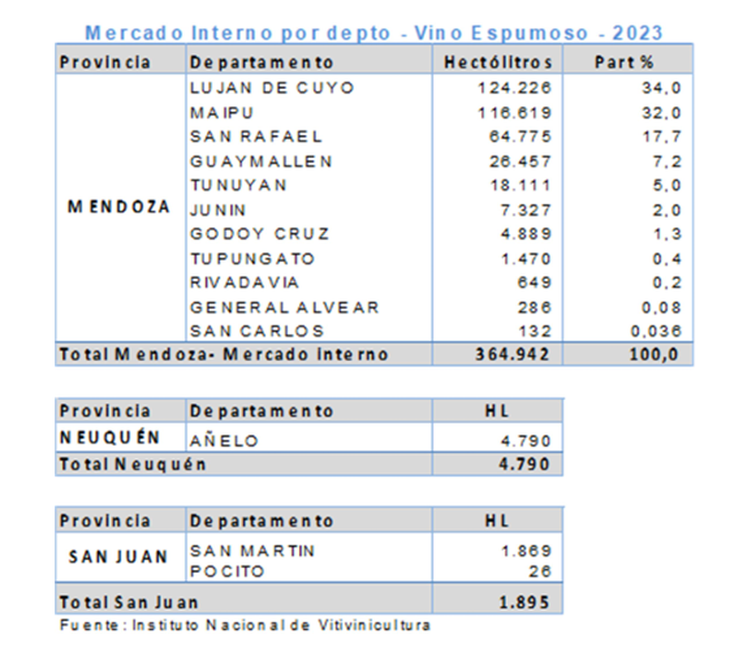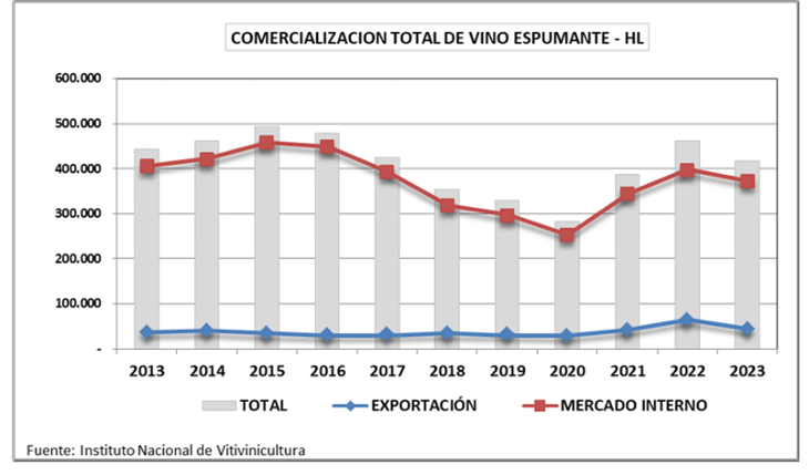 El Instituto Nacional de Vitivinicultura difundió un estudio de coyuntura sobre el mercado de los espumantes. De acuerdo a este informe, en el año 2023 se comercializaron 416.810 hl de vino espumoso. El 89% del volumen comercializado se despachó al mercado local y el 11% restante, tuvo como destino la exportación.