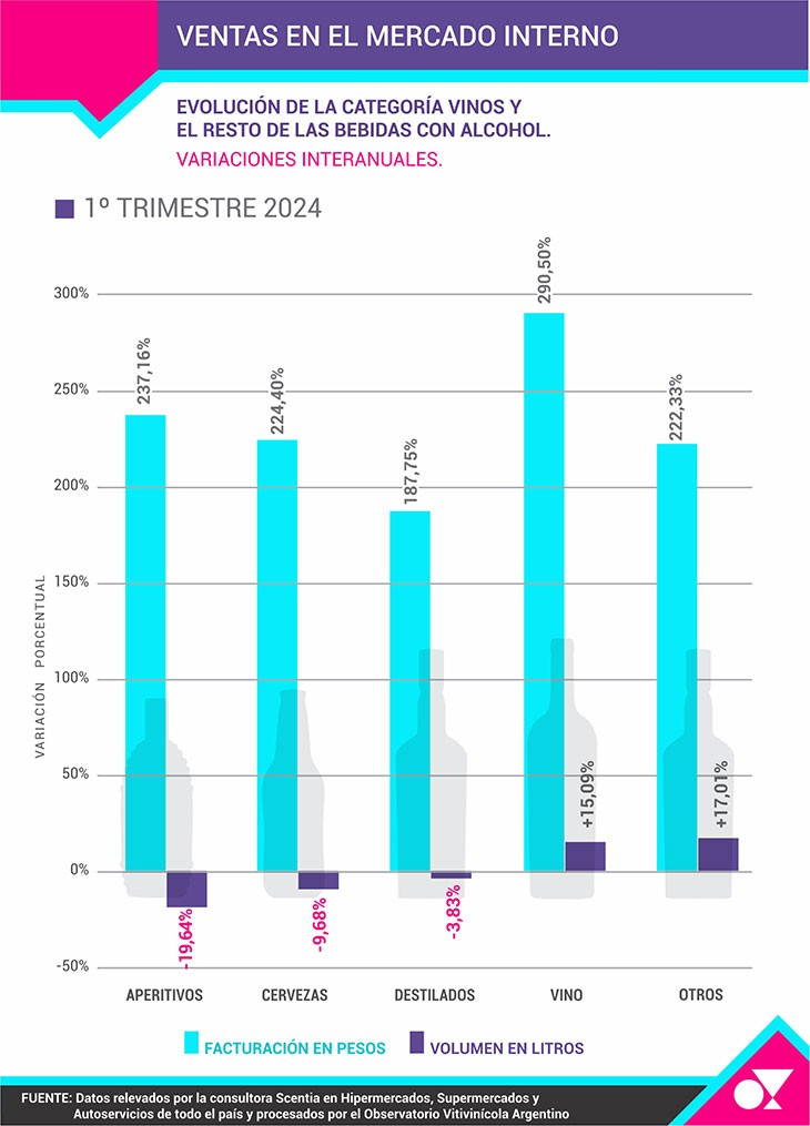 En el primer trimestre del 2024 contra igual período de 2023, las ventas en volumen (litros) de vinos creció 15,09%, mientras que la facturación total subió 290,5% en hipermercados, supermercados y autoservicios de la Argentina relevados por Scentia.