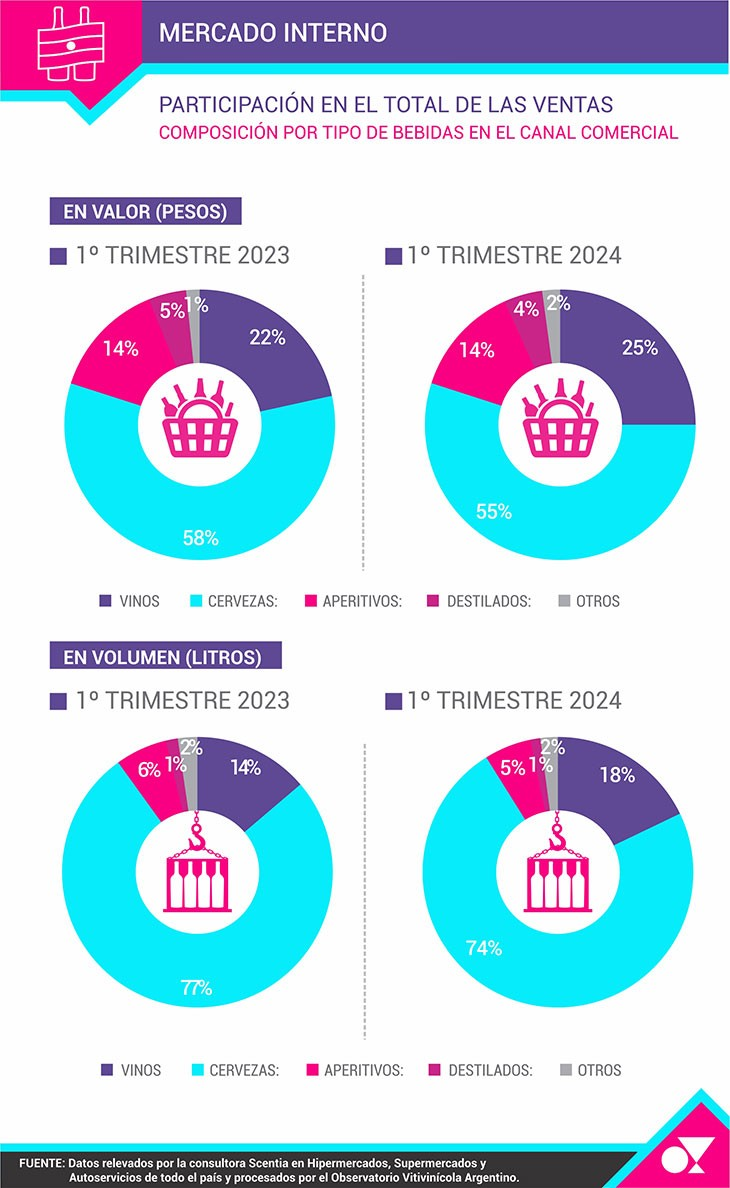 Con estos datos, el vino gana participación dentro del total de ventas tanto en facturación como en volumen entre el primer trimestre de 2023 e igual período de 2024 y pasa del 22% al 25% del total de facturación y del 14% al 18% en el volumen (litros) comercializado.