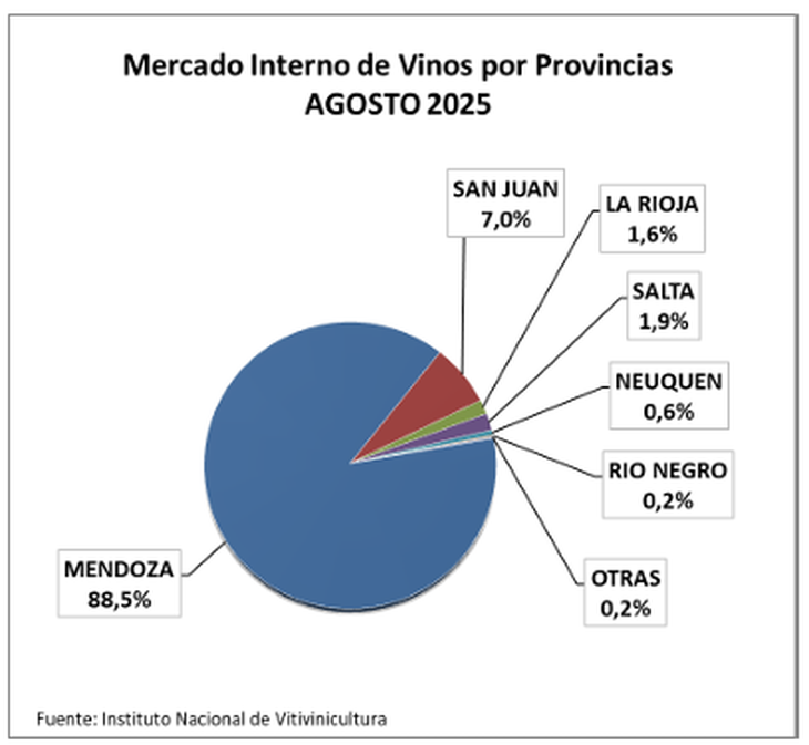 Como es tradicional, la región de Cuyo lidera la producción y comercialización. Mendoza fue el origen del 88,5% del vino despachado al mercado interno en agosto, seguida por San Juan con un 7%.
