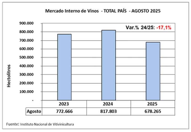 El mercado interno del vino en Argentina encendió las alarmas. Según el más reciente informe del Instituto Nacional de Vitivinicultura (INV), correspondiente a agosto de 2025, las ventas totales en el país sufrieron una caída interanual del 17,1%, alcanzando un volumen de 678.265 hectolitros (hl).
