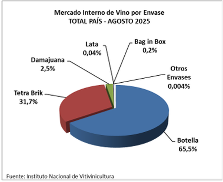 En cuanto a los envases, la botella, que concentra el 65,5% de los despachos, sufrió una fuerte caída del 20,7% en agosto. El tetra-brik, con un 31,7% de participación, tuvo una baja más leve del 7,4%. Preocupa el desplome de formatos como la lata, con una caída del 80,2%.