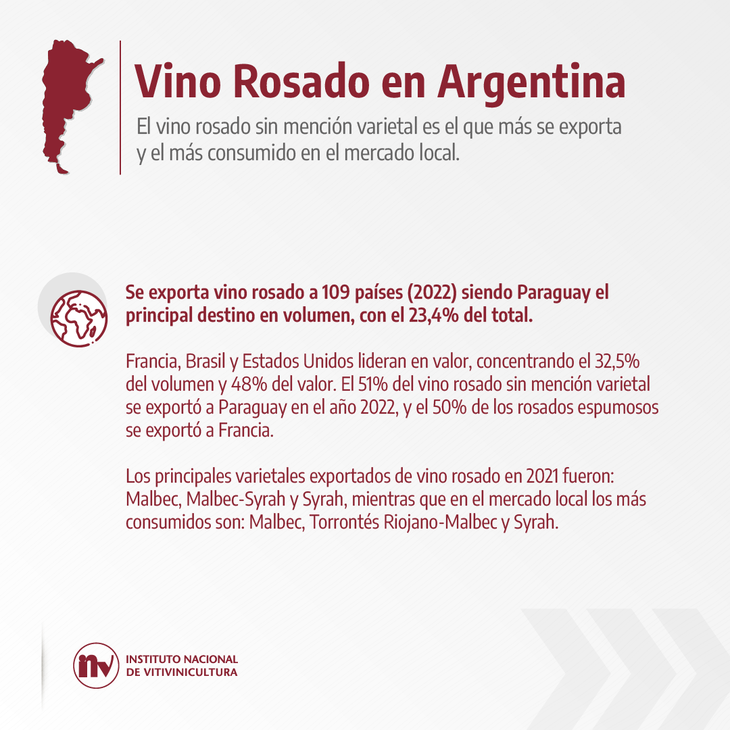 En nuestro país, representa el 4,7% del volumen de ventas en el mercado interno de vino y el 4,6% de las exportaciones. En 2022 se comercializaron 51,5 millones de litros de vino rosado, 76% destinado al mercado interno y 24% se exportó.