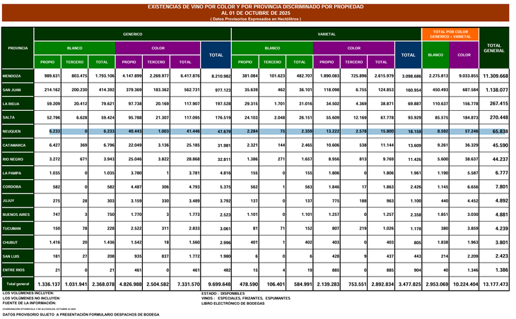 ¿Cuánto vino hay en Argentina? ¿Y en la Patagonia? Los datos provisionales de la Coordinación Vitivinícola y de Alcoholes, con fecha de corte al 1 de octubre de 2025, establecen que las existencias totales de vino en el país alcanzan los 13.177.473 hectolitros (Hl). Estos volúmenes corresponden al estado "disponibles" e incluyen categorías genéricas y varietales, pero no contemplan los vinos especiales, espumantes o frizzantes.