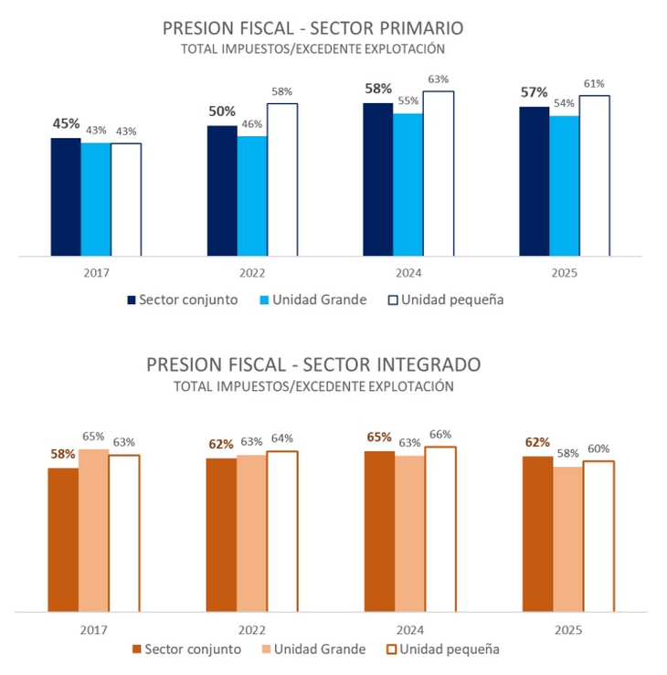 Por tamaño de empresa, la presión sube al 61,2% para fincas pequeñas y baja al 53,6% en el caso de fincas grandes. En el ámbito de las bodegas, se ubica en 63,4% para las pequeñas y en 58,4% para las grandes, detalla el informe.