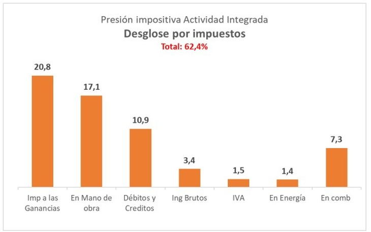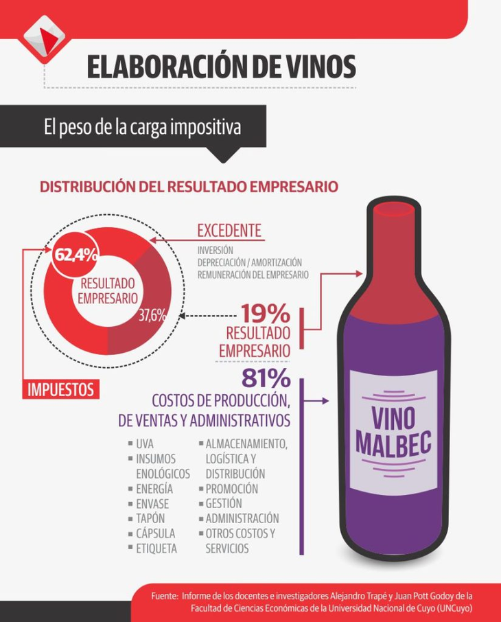 Otra forma de visualizar el peso de los impuestos es el ejemplo de una bodega en Mendoza con producción propia de uvas para vinificar. Sobre el total de ingresos (100%), los costos de producción, venta y administración se llevan el 81%, dejando un resultado empresario inicial del 19%. De este excedente de producción (19%), el pago de impuestos absorbe el 62,4%.