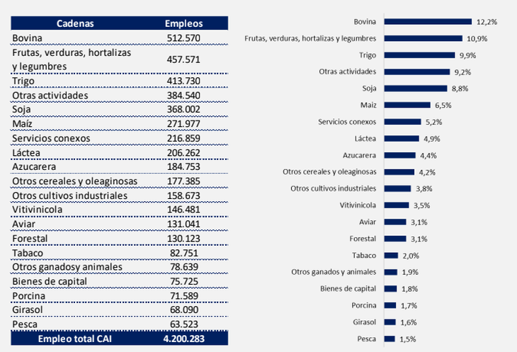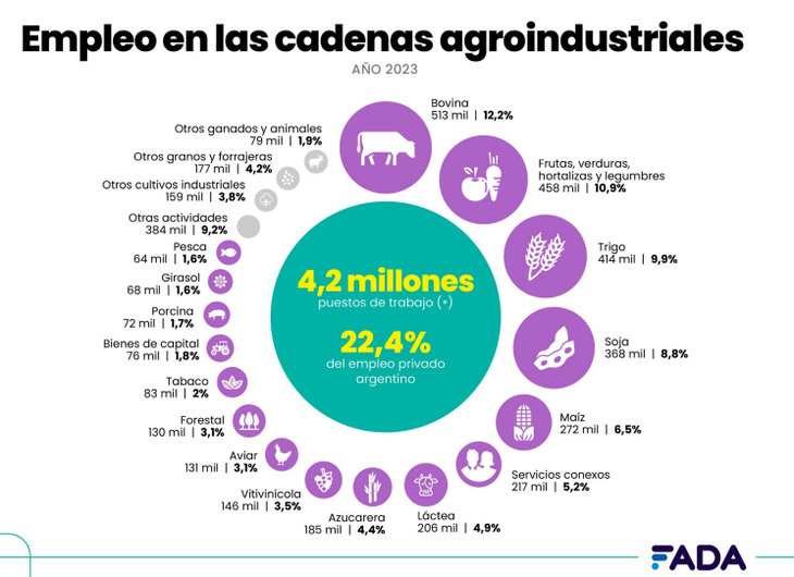 "Si agrupamos a las cadenas agroindustriales (CAI) en grandes bloques, las cadenas agrícolas (soja, maíz, trigo, girasol y otros cultivos) son las principales generadoras de empleo, concentrando el 30,9% del total. Les siguen las cadenas regionales (vitivinícola, azucarera, tabaco, forestal, etc.), que aportan el 29,1%, y en tercer lugar, las cadenas pecuarias (carnes y leche), con el 23,8% del empleo dentro de la CAI. Completan la distribución otras actividades (9,2%), servicios conexos (5,2%) y bienes de capital (1,8%)", detalla el reporte de FADA.