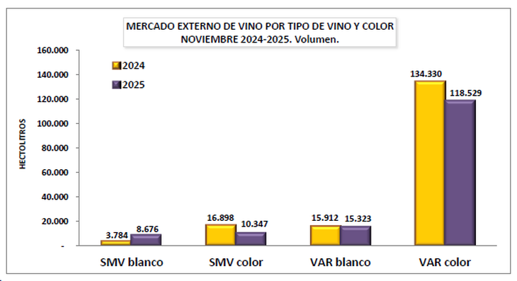 Formatos innovadores: En el mes de noviembre, el Tetra Brik registró un crecimiento espectacular del 108,2% en volumen, sumando 2.358 hl, una señal de la búsqueda de formatos más económicos o de nichos específicos.